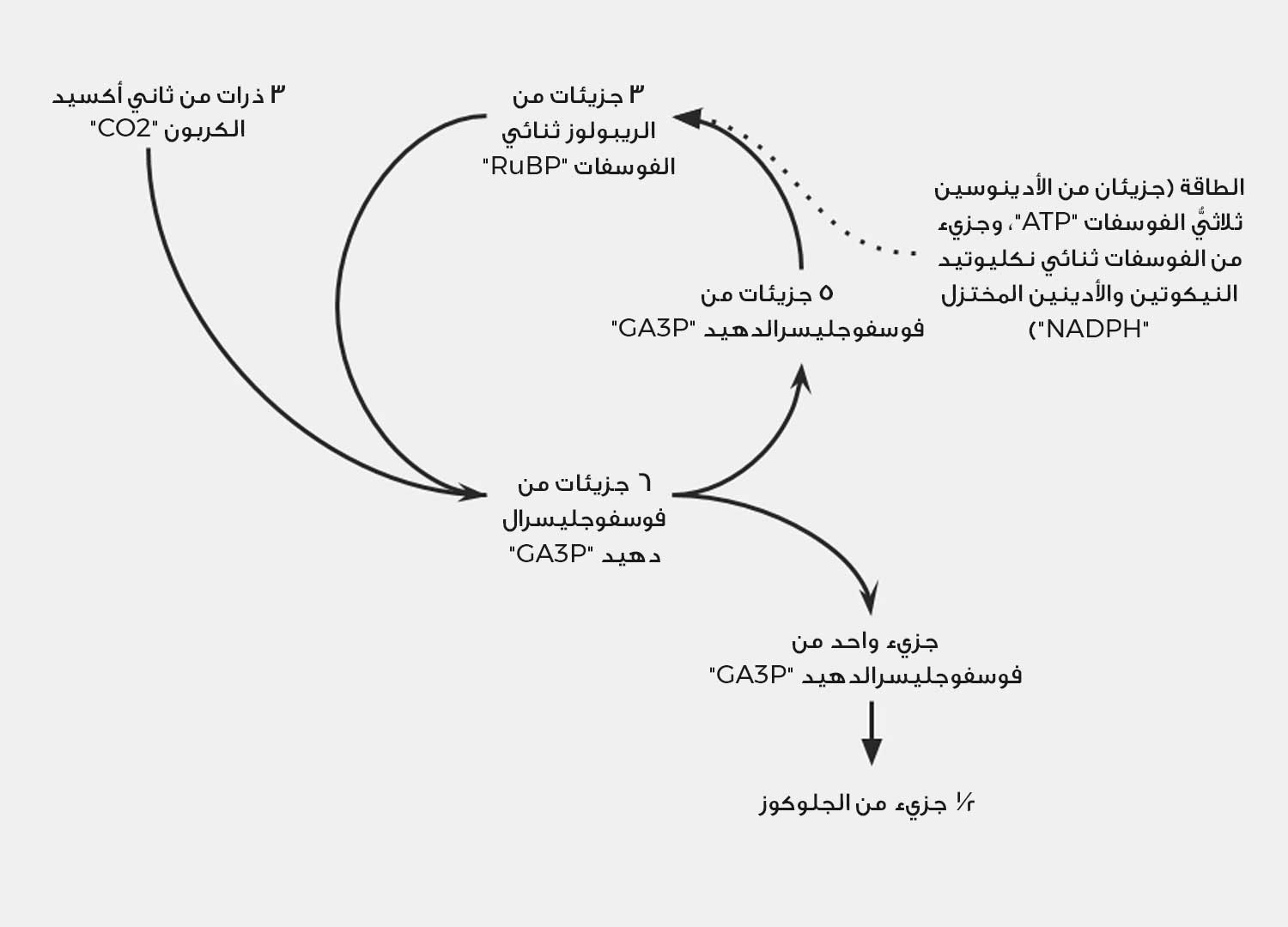 وفي دورة كالفين، يتفاعل جزيء ثاني أكسيد الكربون مع الريبولوز ثنائي الفوسفات (RuBP)، وهو جزيء يحتوي على خمس ذرات من الكربون، مضيفًا ذرة كربون واحدة لإنتاج جزيئين من فوسفوجليسرالدهيد (GA3P)، اللذيْن يحتوي كل منهما على ثلاث ذرات من الكربون.